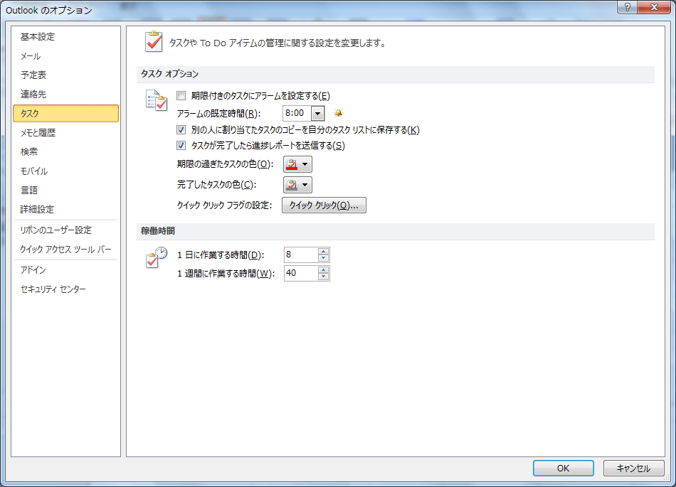 Outlookのタスクに様々なオプションを設定することができます。アラームの既定時間は8時間、期限の過ぎたタスクの色は赤色、完了したタスクの色はグレー、クイックフラグは「今日」に設定されています。これらを変更するには、Outlookのオプションの[タスク]タブを開き、[タスク オプション]からそれぞれ設定します。