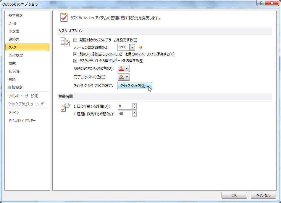 - [Outlookのオプション]ダイアログボックスの[タスク]タブを選択します。