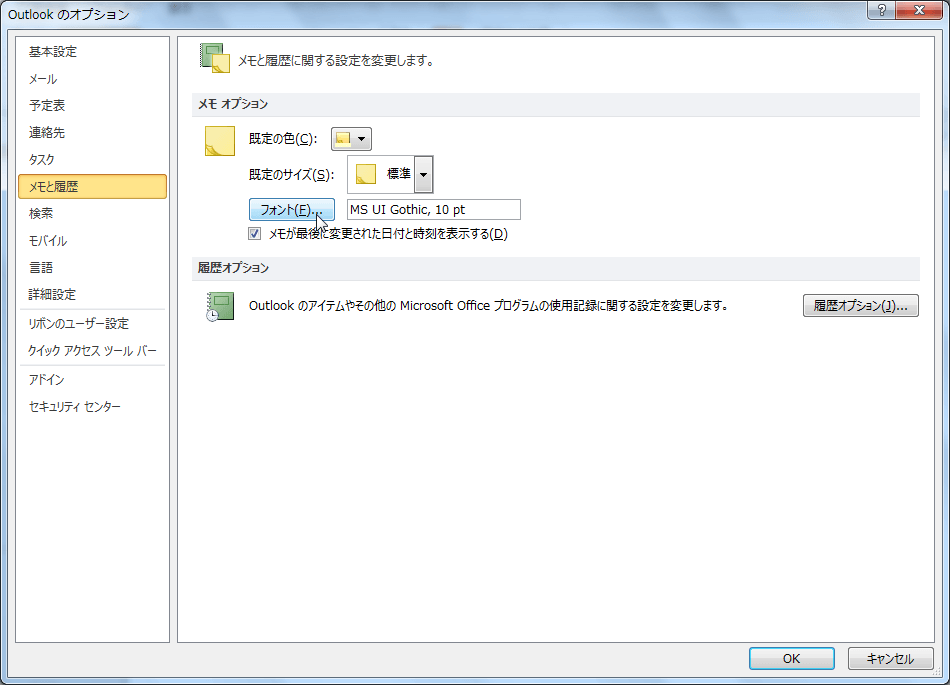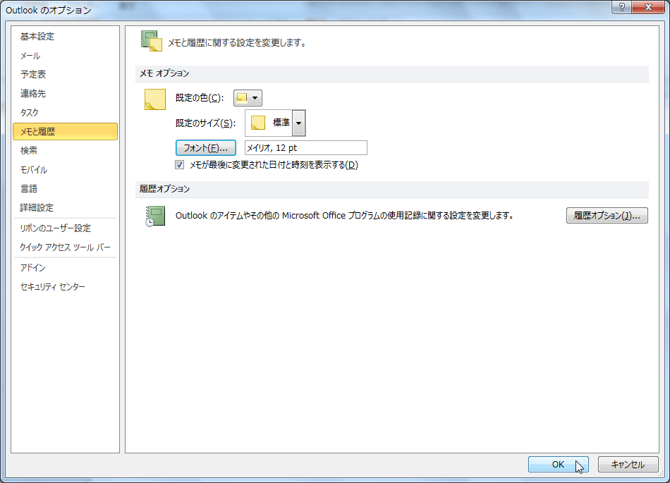 - [Outlookのオプション]ダイアログボックスの[メモと履歴]タブを開きます。