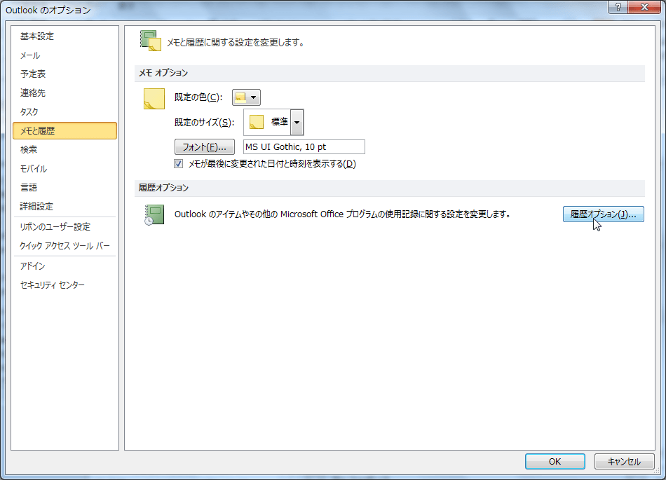 - [Outlookのオプション]ダイアログボックスの[メモと履歴]タブを開きます。