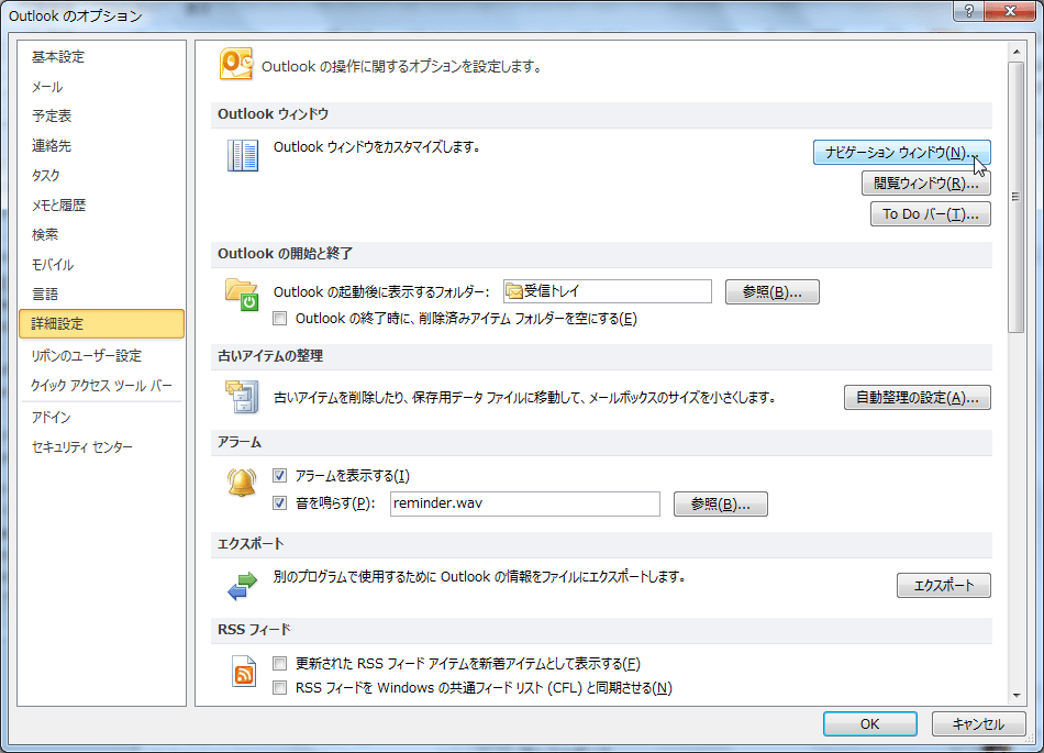 [Outlookのオプション]ダイアログボックスを開き、[詳細設定]タブの[Outlookウィンドウ]グループの[ナビゲーションウィンドウ]ボタンをクリックして、[ナビゲーションオプション]ダイアログボックスにて、ナビゲーションの順序や表示方法などを変更することができます。