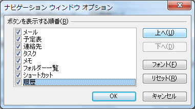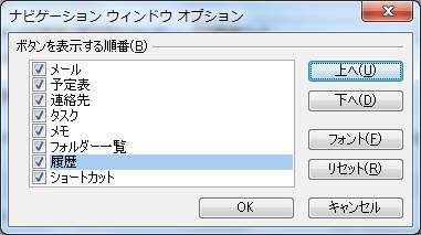 [ナビゲーション ウィンドウ オプション]ダイアログボックスにて、順序を変更したいボタンを選択して[上へ]または[下へ]ボタンをクリックします。