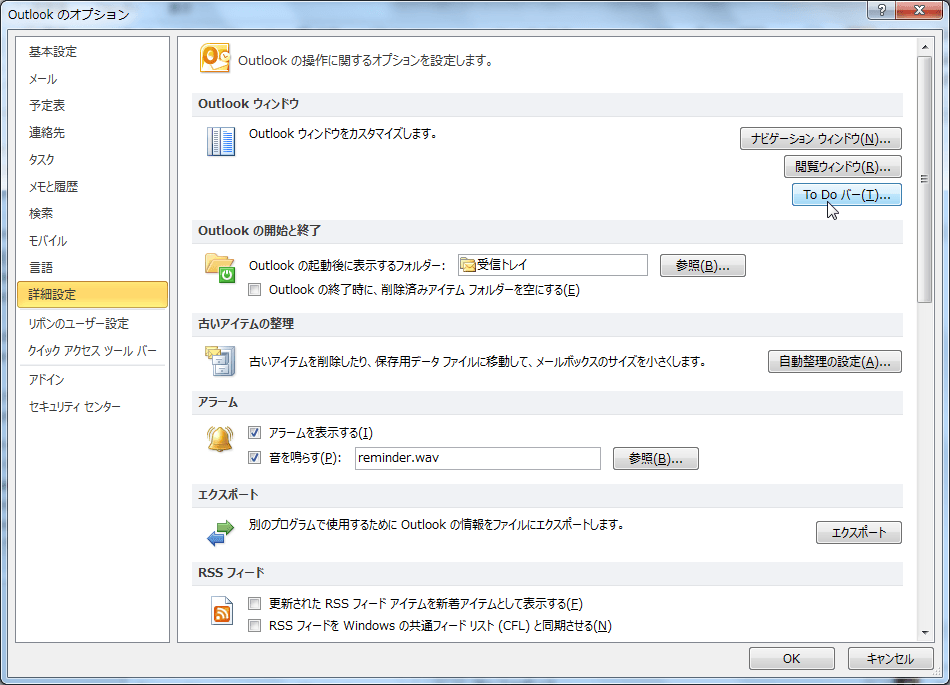 - [Outlookのオプション]ダイアログボックスの[詳細設定]タブを開きます。