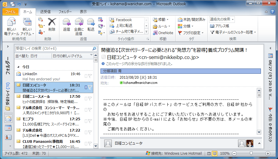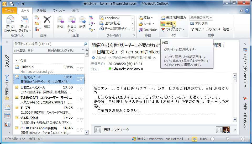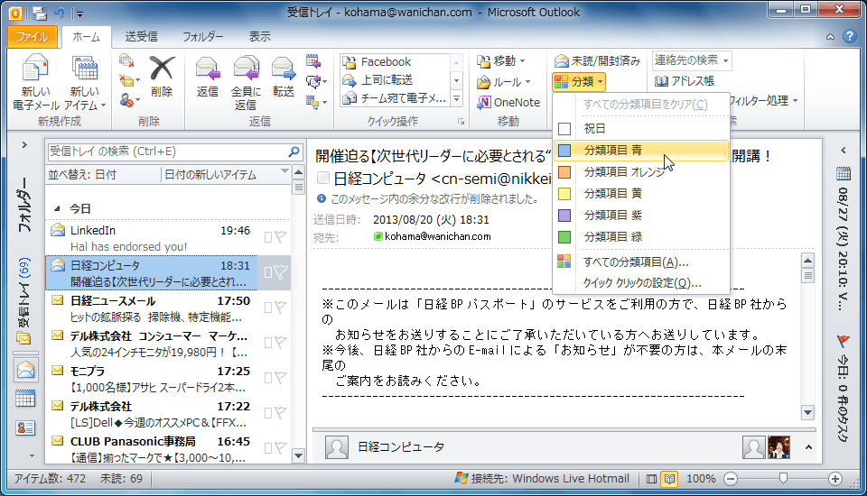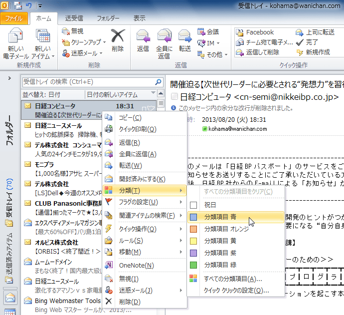 分類したいアイテムを右クリックし、ショートカットメニューより[分類]をポイントして、分類する色を選択します。もしくは、[ホーム]タブの[タグ]グループの[分類]をクリックし、一覧から分類する色を選択します。