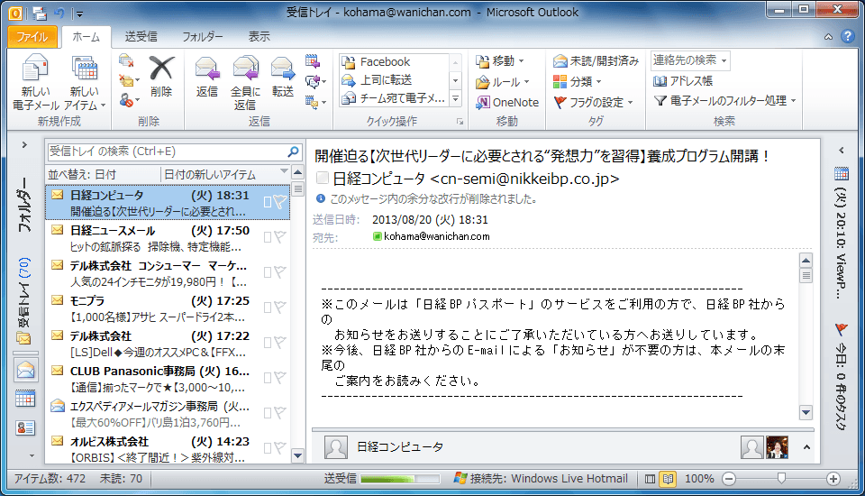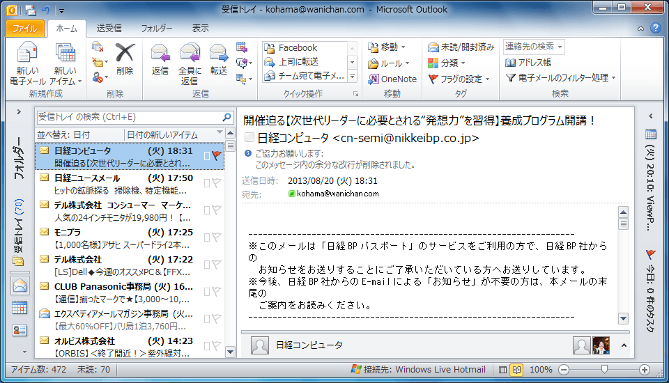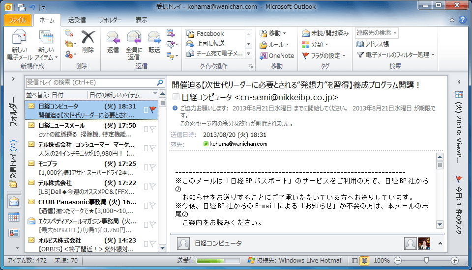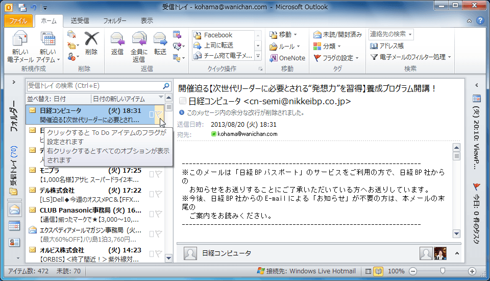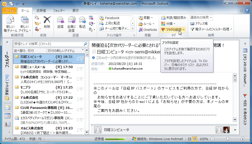 情報ビューアのそれぞれのアイテムの右側にフラグアイコンが薄く表示されているので、そのフラグをクリックすることで簡単にフラグの設定が行えます。なお、この操作でのフラグは今日の日付が期限として設定されます。