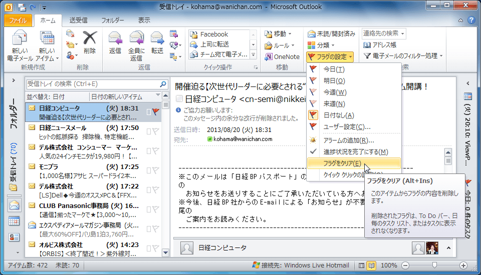 - [ホーム]タブの[タグ]グループの[フラグの設定]をクリックして[フラグをクリアする]をクリックします。