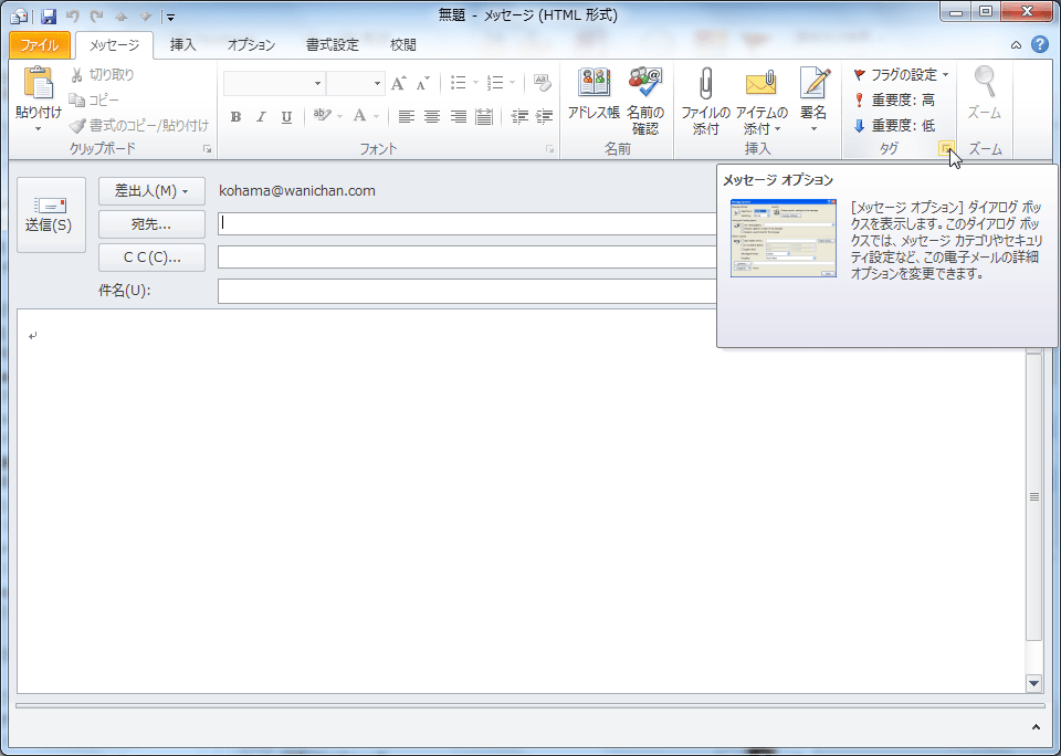 - 新規メッセージウィンドウの[メッセージ]タブを開きます。