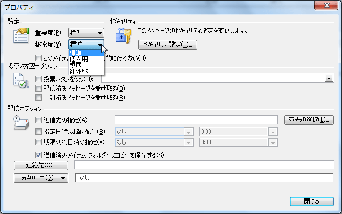 - [プロパティ]ダイアログボックスの[秘密度]ボックス一覧から「個人用」「親展」「社外秘」のいずれかを選択します。