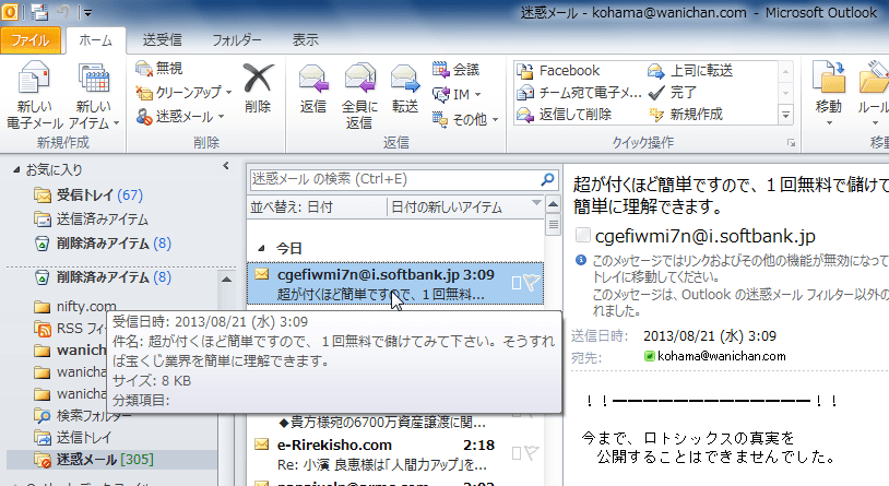 - プロパティを表示したいメッセージをダブルクリックして開きます。閲覧ウィンドウで表示ではなく、メッセージアイテムを別ウィンドウで開きます。