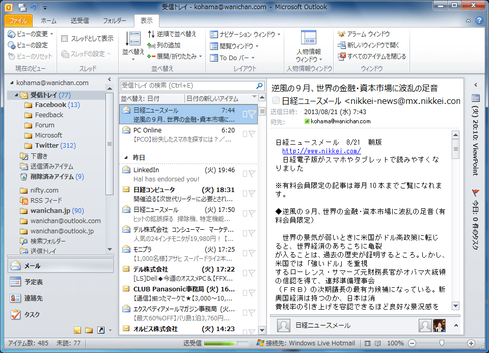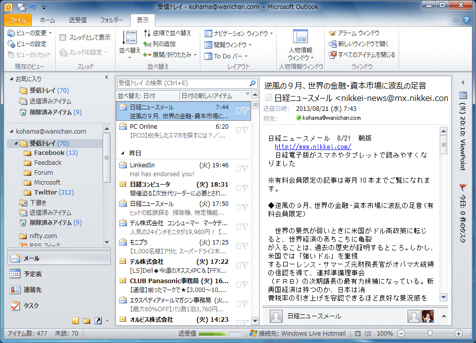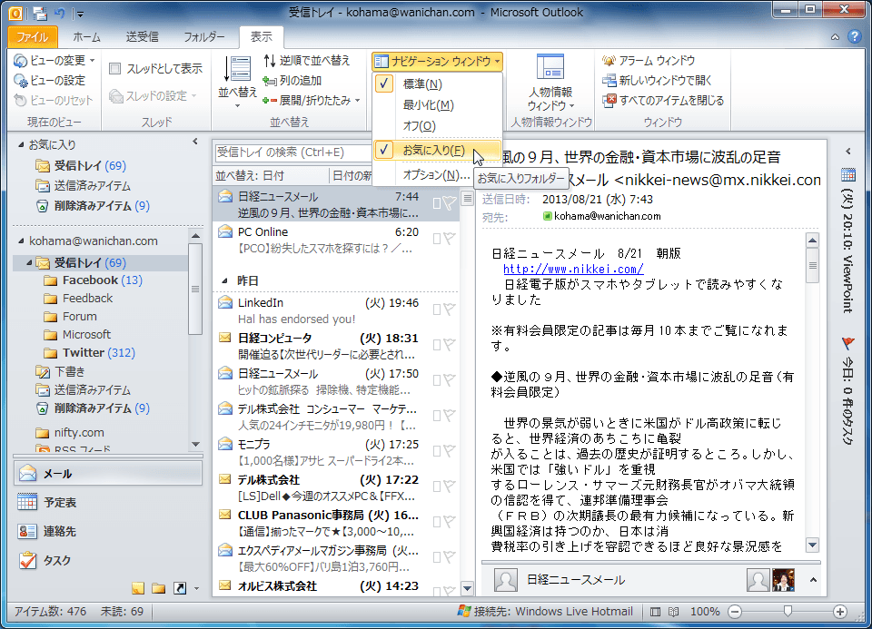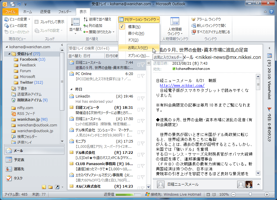 ただし、ナビゲーションウィンドウを[オフ]にすると、現在のフォルダーのみ表示され、メールから予定表、連絡先といったビューに切り替えることもできなくなります。
