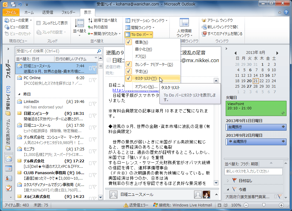 - [表示]タブを開き、[To Do バー]をクリックします。