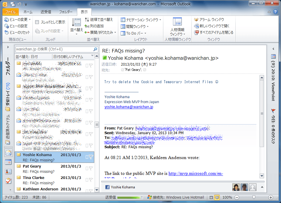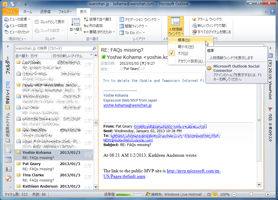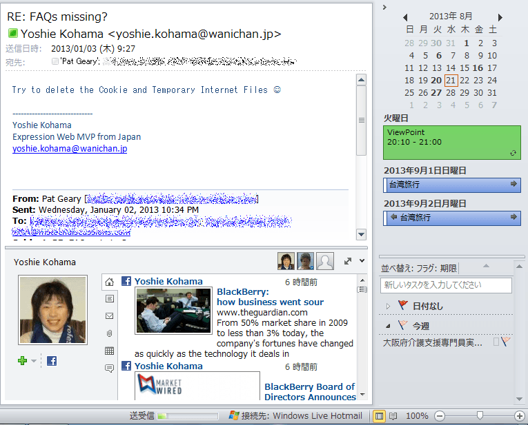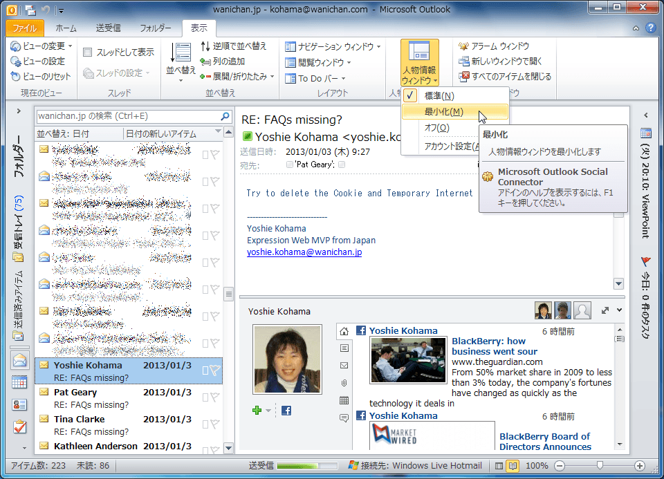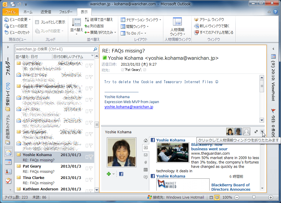 メールのメッセージアイテムには人物情報ウィンドウ機能が備わっています。FacebookやLinkedInなどのソーシャルネットワークと接続することで、その人物がFacebookを利用している場合、写真にはFacebookのプロフィール写真が表示され、FacebookのデータがOutlookで確認できます。