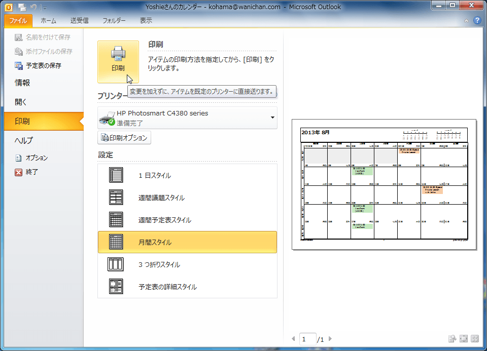 [ファイル]タブを開き、[印刷]をクリックして、予定表スタイルを選択し[印刷]をクリックします。