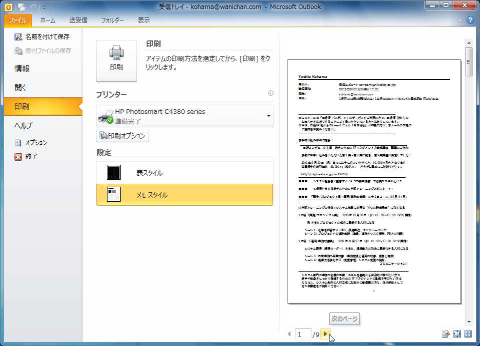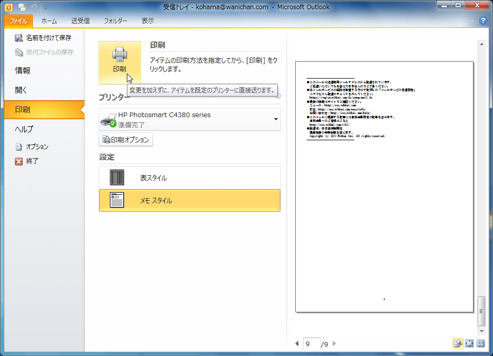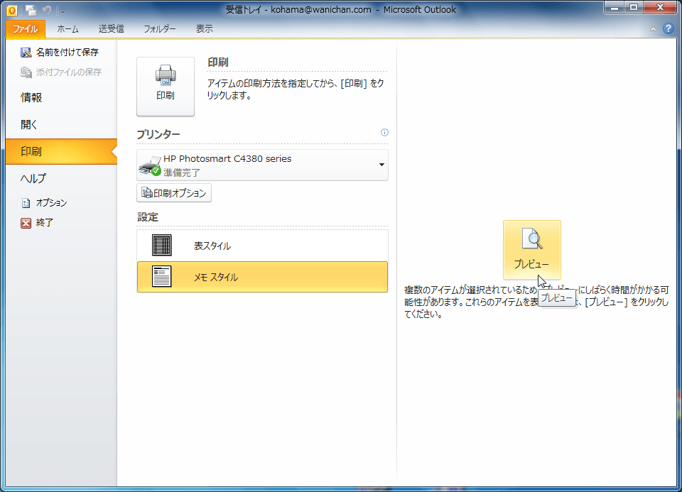なお、メールの内容を印刷する場合は[メモスタイル]、メールアイテムの一覧の場合は[表スタイル]を選択します。ここでは[メモスタイル]のままでOKです。
