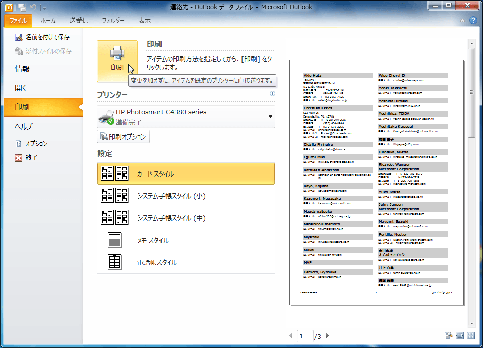 連絡先一覧を印刷する場合、カードスタイル、システム手帳スタイル、電話帳スタイルなどがあります。メモスタイルを選択すると1枚につき1件のみ印刷されます。希望の印刷スタイルを選択して連絡先一覧を印刷してみましょう。