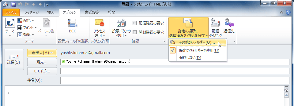 指定の場所に送信済みアイテムを保存