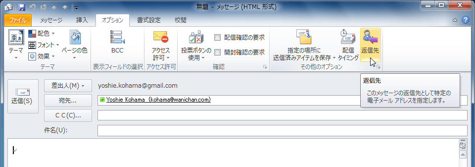 - [返信先の指定]にチェックを入れて、電子メールアドレスを指定します。