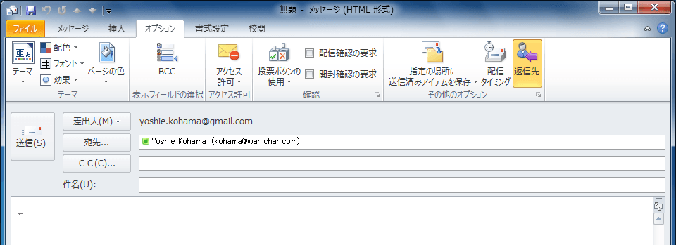 配信オプションとして、返信先の電子メールアドレスの指定、配信する日時、期限切れの日時の設定が行えます。メッセージウィンドウの[オプション]タブを開き、[その他のオプション]グループのなかから指定したいオプションを選択します。