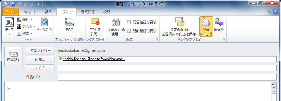 - メッセージウィンドウの[オプション]タブを開き、[配信タイミング]をクリックします。