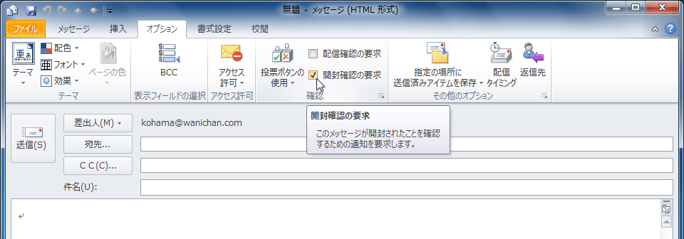 - [確認]グループの[開封確認の要求]にチェックを入れます。