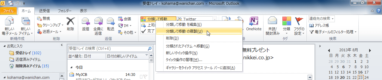 クイック操作コマンドをコピーするには、対象となるコマンドを右クリックして、ショートカットメニューより[○○ の複製]を選択します。[クイック操作の管理]ダイアログボックスを表示して、複製したいクイック操作を選択して[複製]ボタンをクリックしてもOKです。