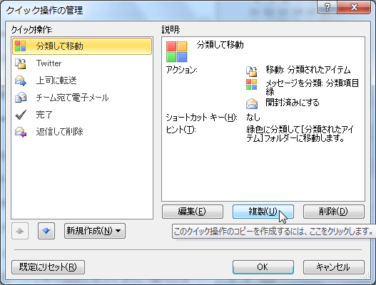 - [クイック操作の管理]ダイアログボックスが表示されるので、その中から複製したいクイック操作を選択し、[複製]ボタンをクリックします。