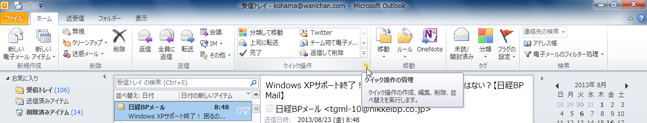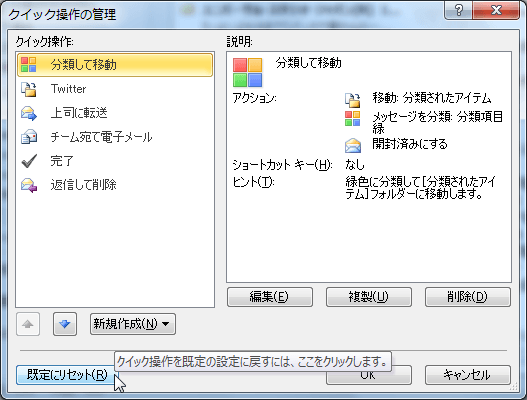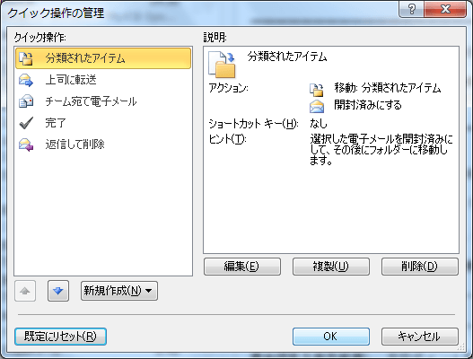 - [クイック操作の管理]ダイアログボックスの[OK]ボタンをクリックします。