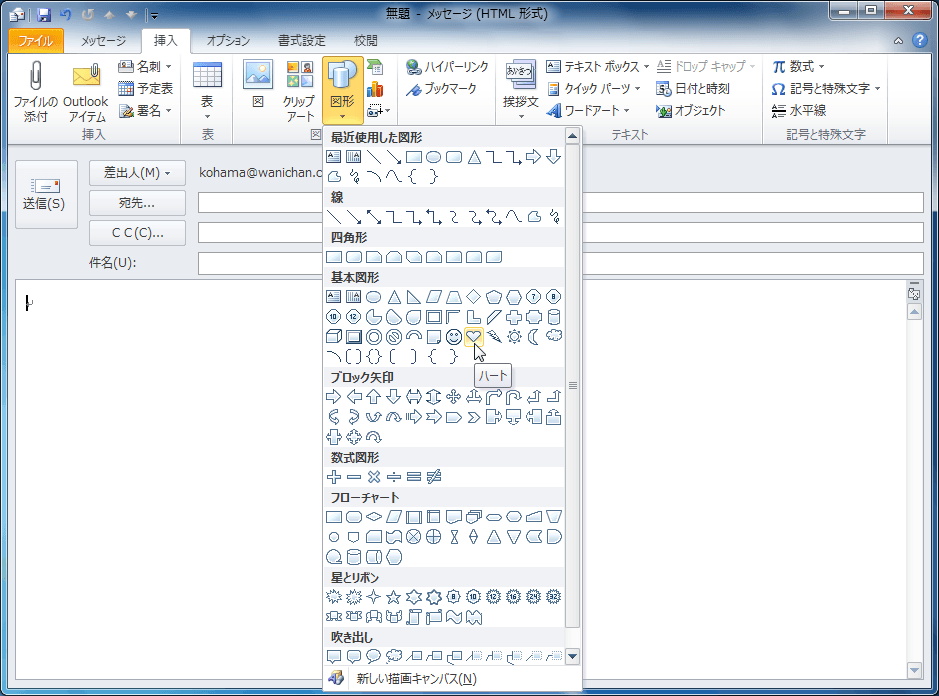 - [挿入]タブを開き、[図]グループから[図形]を選択します。