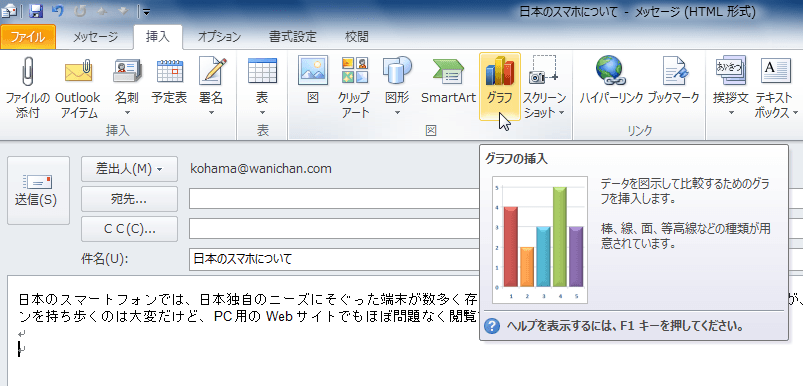 Outlookのコンテンツにグラフを挿入することもできます。実際には、コンテンツ部分にWordの機能が埋め込まれていて、その中にExcelのワークシートがオブジェクトとして挿入される仕組みになります。