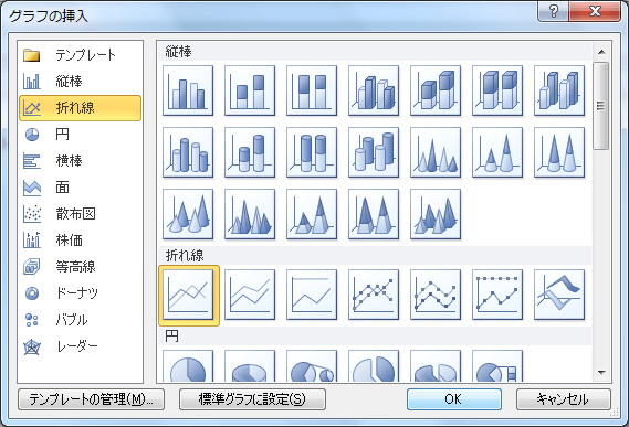- [グラフの挿入]ダイアログボックスの[折れ線]カテゴリより[折れ線]を選択して[OK]ボタンをクリックします。