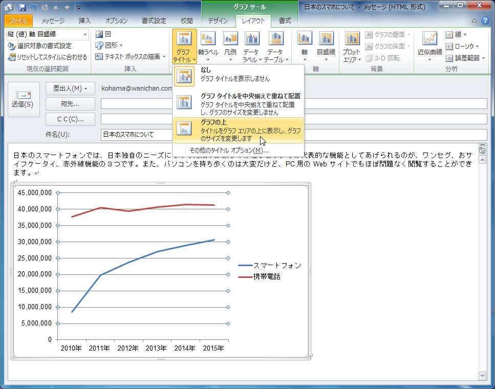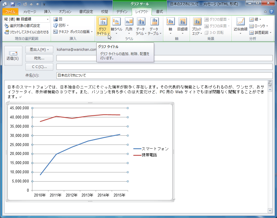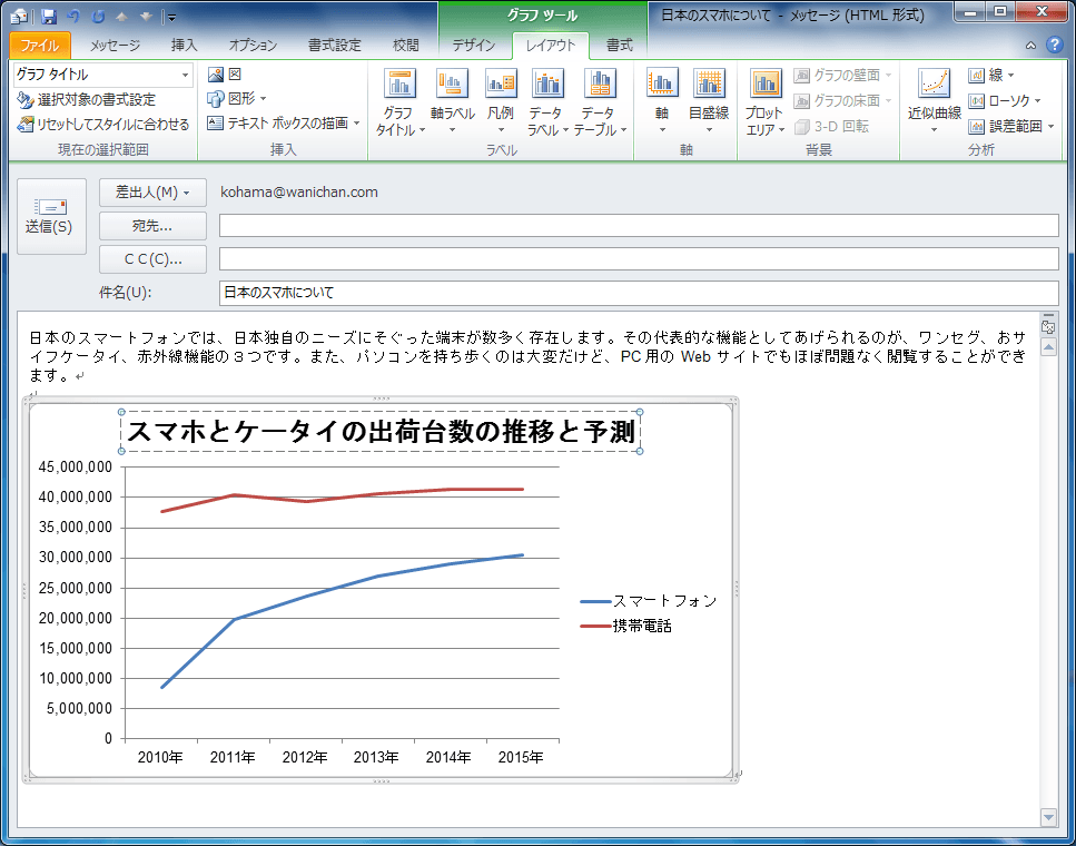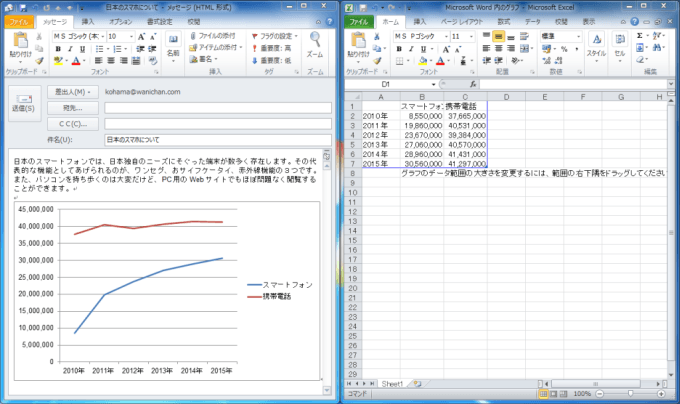 - Excelの数値は自動的にOutlookに挿入されたグラフに反映されます。