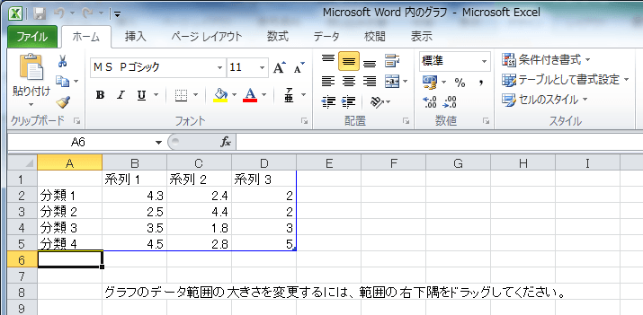 - 「Microsoft Word 内のグラフ」が開かれました。青い境界線の中にデータを入力していきます。青い境界線の中にカーソルを移動してデータ入力