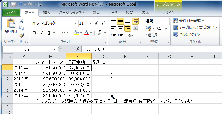 範囲の右下隅をドラッグしてグラフのデータ範囲の大きさを変更する