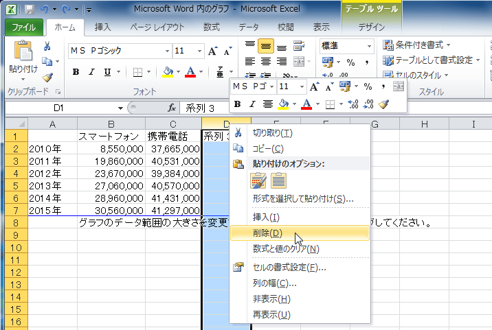 - 不要な系列は列を削除するだけでOKです。不要な列を右クリックしてショートカットメニューより[削除]を選択