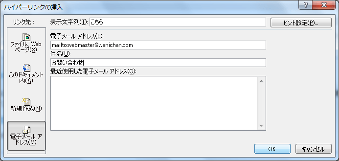 - [電子メールアドレス]ボックスに最初の文字を入力すると、自動的に mailto: が付加されます。