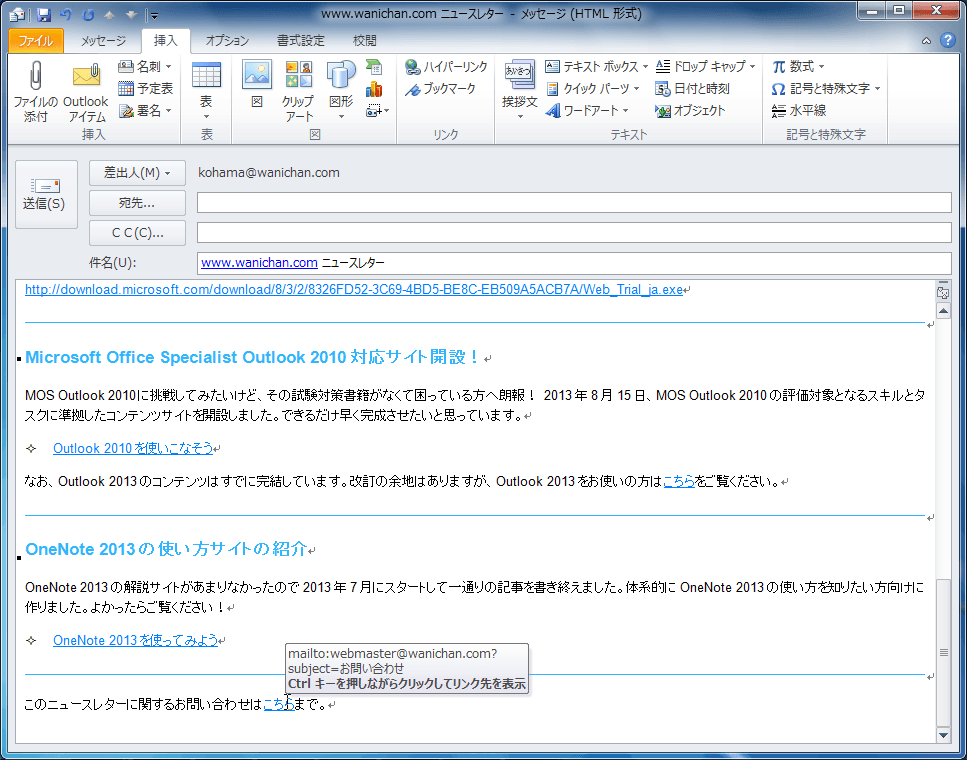 ここでは、メールアドレス以外の文字列に電子メールアドレスへのリンクを挿入する方法について説明します。