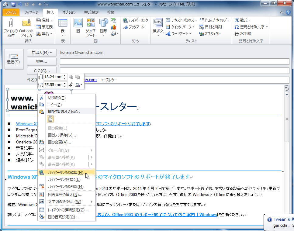 - リンクを編集したい部分を右クリックして、ショートカットメニューより[ハイパーリンクの編集]をクリックします。