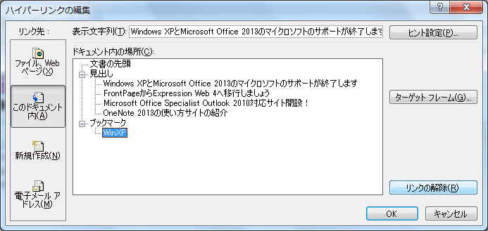 - [ハイパーリンクの編集]ダイアログボックスの[リンクの解除]ボタンをクリックして[OK]ボタンをクリックします。