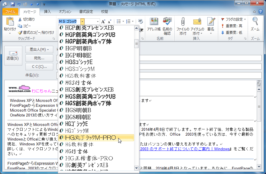 文字の書体を変更するには、[メッセージ]タブまたは[書式設定]タブを開き、[フォント]グループの[フォント]ボックス一覧から書体を選択します。[フォント]グループの[ダイアログボックス起動ツール]をクリックして設定することも可能です。