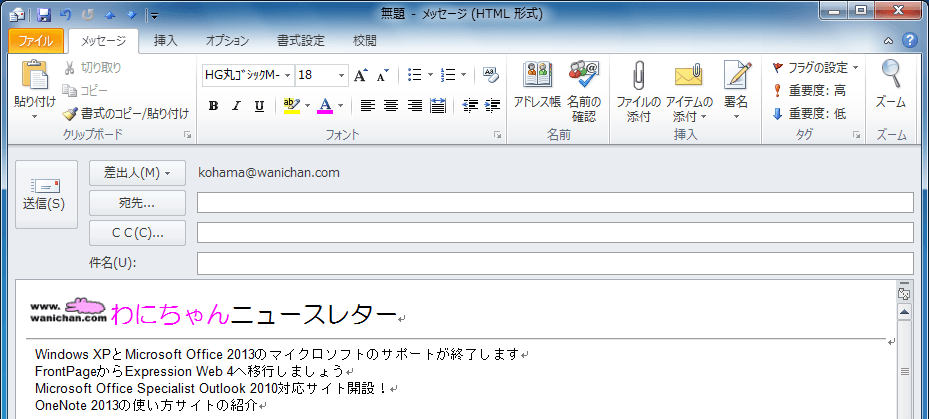 文字サイズを変更するには、[メッセージ]タブまたは[書式設定]タブを開き、[フォント]グループの[フォントサイズ]ボックス一覧からサイズを選択します。[フォント]グループの[ダイアログボックス起動ツール]をクリックして設定することも可能です。