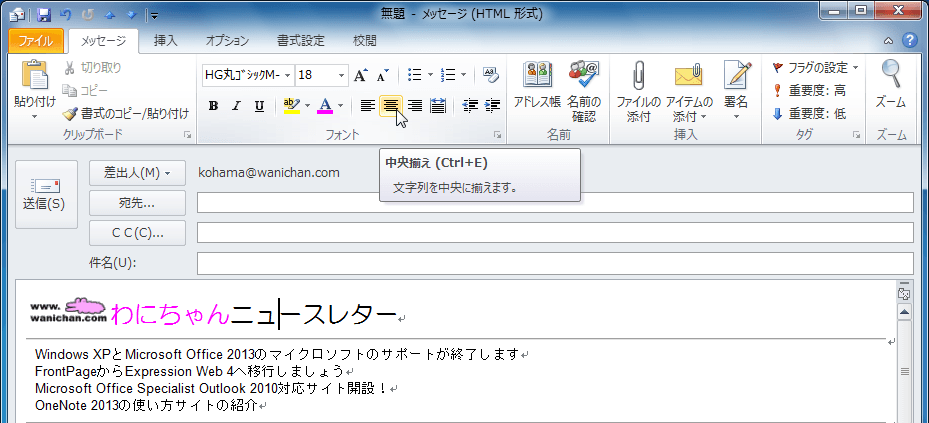 HTMLメールメッセージやその他のアイテムでは、文字の配置を変更することができます。[メッセージ]タブの[フォント]グループ、もしくは[書式設定]タブの[段落]タブから