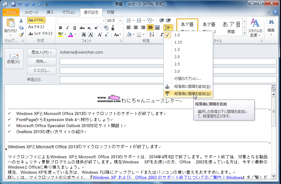[行と段落の間隔]ボタンをクリックします。 - [段落後に間隔を追加]をクリックします。