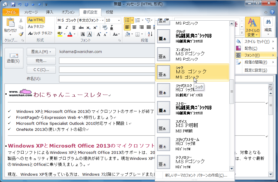 これまで、スタイルセットと配色の変更までは行ったけれども、どうもフォントが文書のイメージに合わない、フォントだけを素早く変えたい場合、それぞれのスタイルのフォントを変えなくても、フォントパターンを変更することによって瞬時に変えることができます。