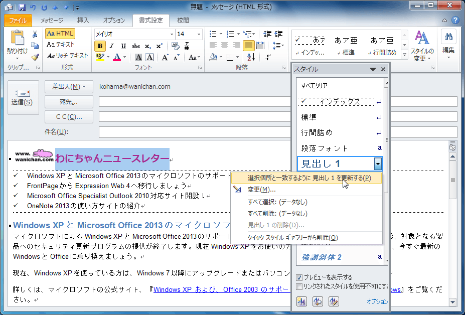 本文テキスト上にスタイルを直接変更して、スタイル一覧からスタイルを更新することができます。たとえば、見出しっぽいスタイルを視覚的に見出しのようにスタイルを適用したあとに、そのスタイルの箇所を選択して、スタイル一覧から見出しスタイルを右クリックして選択個所を一致するようにスタイルを更新することで、後でスタイルを整えることができます。