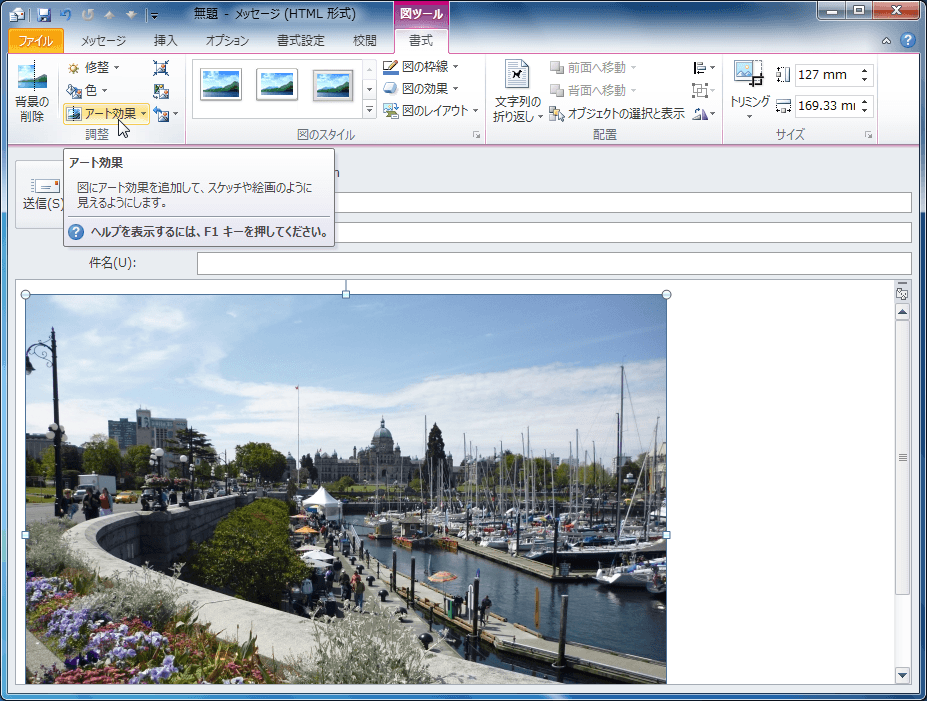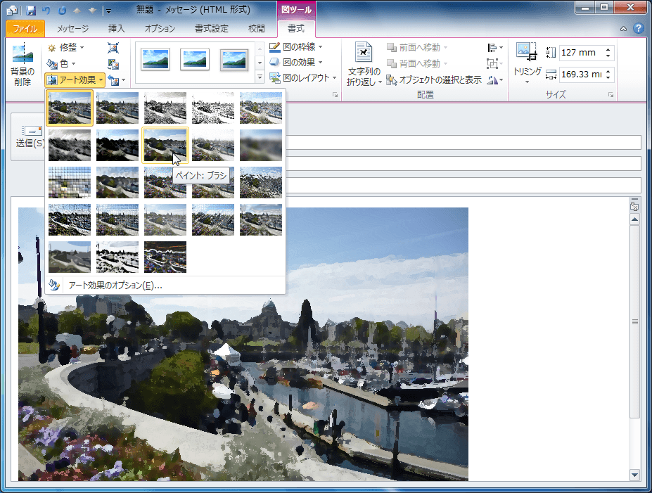 鉛筆やマーカー、ペイントなどのアート効果を適用するには、[図ツール]の[書式]タブを開き、[調整]グループの[アート効果]をクリックして、一覧から選択します。