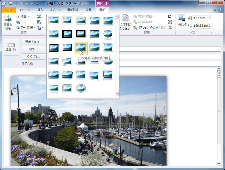 図形の縁に面取りやフレームなどのスタイルを適用して、スナップ写真のようにすることができます。図を選択し、[図ツール]の[書式]タブを開いて、[図のスタイル]グループのクイックスタイル一覧から目的のスタイルを選択します。