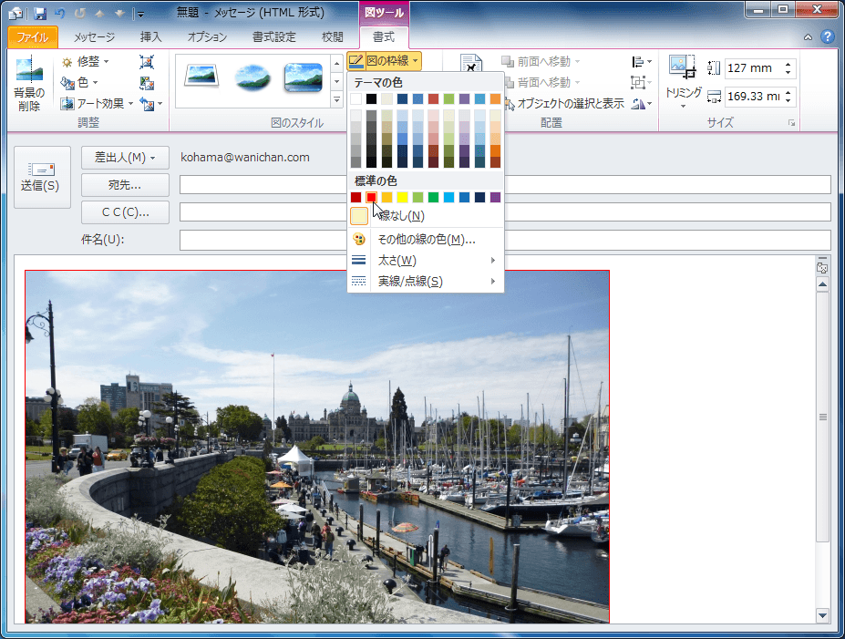 既定では0.75ptの太さの実線で枠線を付けることができます。[図の枠線]ボタンの左側をクリックすると、選択された色で枠線を引くことができます。他の色を指定するには、以下の手順に従います。