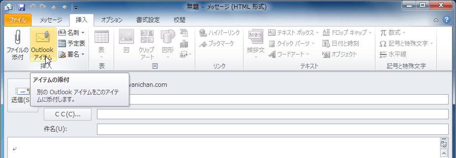- [挿入]グループの[Outlookアイテム]を選択します。