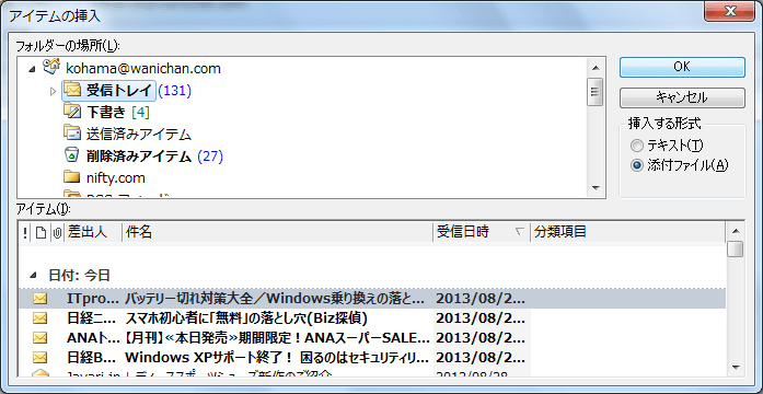 - 挿入したいOutlookアイテムを選択して[OK]ボタンをクリックします。