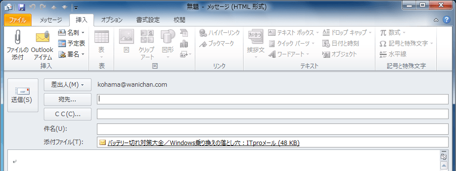 メールメッセージアイテムやタスク、メモを添付するには、[挿入]タブの[Outlookアイテム]コマンドを選択しますが、Outlookを持っていない人宛てに予定表を送信、あるいは電子名刺を添付する場合はそれぞれの特定のコマンドから行います。